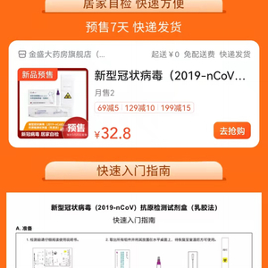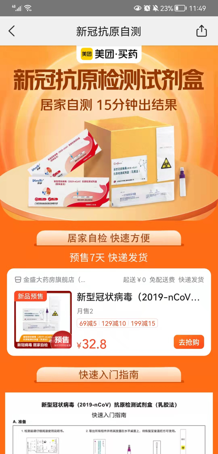 3月13日,贝壳财经记者在美团买药上看到,提前上线预售的金沃夫所生产的新冠抗原检测试剂盒,显示“15分钟出结果”,单价为“32.8元”。