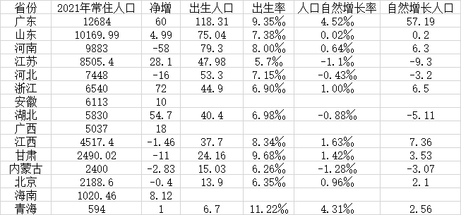 相比之下,广东、河南受计划生育政策变化的影响较小。另外,广东虽然经济发达,城镇化率很高,但广东的人口出生率一直比较高。数据显示,2021年广东人口出生率为9.35‰,比全国平均水平高出2.17个百分点,在12个已公布出生率的省份中位居第三。