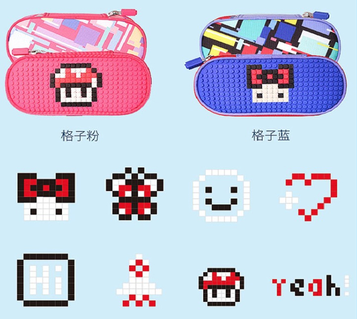例如,一款拉链帆布文具盒,在盒面上均匀排满类似乐高一样的点状凸起,每个文具盒附赠80颗彩色像素方块以及图纸。孩子可以将像素方块按压在文具盒面,拼出相应图案,也可自己发挥创造。这款“智趣拼图文具盒”售价百元左右,以“每天都能换新包”为卖点,宣称可以让孩子爱上创造、学会分享收获更多朋友、助力耐心毅力养成……