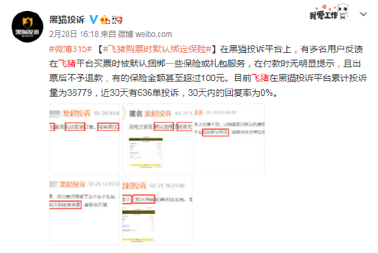 黑猫投诉平台上,不少消费者投诉,在购买火车票、机票时被默认捆绑意外险。