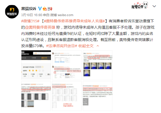 黑猫投诉平台上,大量消费者投诉乐堂动漫旗下的奥特曼英雄传奇诱导未成年人充值且客服不予处理,并称孩子在游戏内消费时未经过任何实名认证,甚至有未成年人在游戏内充值15000多元。