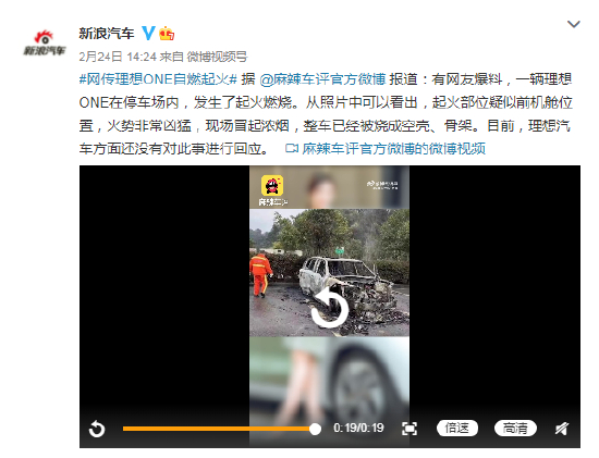 2021年2月有网友曝出理想ONE在停车场内自燃照片,起火部位疑似前机舱位置,火势凶猛,现场冒起浓烟,随后照片显示,整车已经被烧成空壳、骨架。
