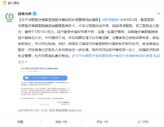 网红小冉(戴某某)到华颜医疗美容医院做抽脂手术,两个多月后因全身感染造成多器官衰竭,最终死亡。杭州卫健委发布通报称,经市医学会组织专家评估,这是一起医疗事故,华颜医疗美容医院存在术前缺乏认识、术中操作不当、术后观察处理不及时等过错,与患者死亡存在因果关系,承担全部责任,并已作出赔偿。