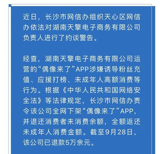 去年9月长沙市网信办约谈并责令下架一款名为“偶像来了”的APP,并退还消费者未消费余额。该APP涉嫌诱导粉丝充值、应援打榜、未成年人高额消费等行为。