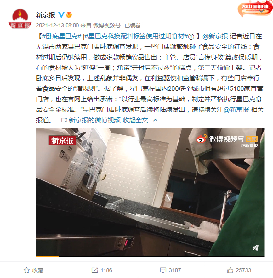新京报记者在星巴克门店卧底调查发现,一些门店频繁触碰了食品安全的红线:食材过期后仍继续用,做成多款畅销饮品售出;主管、店员“言传身教”篡改保质期,有的食材被人为“延保”一周;承诺“开封后不过夜”的糕点,第二天偷偷上架。
