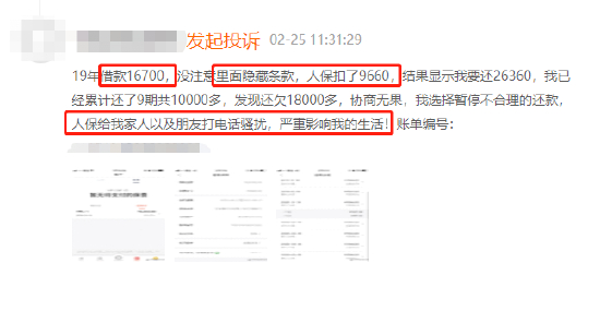 黑猫投诉平台上,较多消费者反馈贷款时被捆绑人保财险。有消费者贷款16700元,没注意到隐藏条款,被人保财险扣费9660元。
