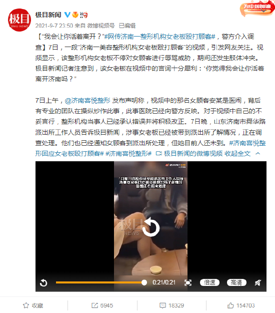 2021年9月,“济南一美容整形机构女老板殴打顾客”的视频,引发网友关注。经澎湃新闻记者调查发现,喜悦整形全称为“山东沃德喜悦医疗美容有限责任公司”,其实际经营范围并不包括整形外科、美容外科等经营范围。此外,在济南市卫健委的网站上查询医疗机构资质,也查不到该医院。