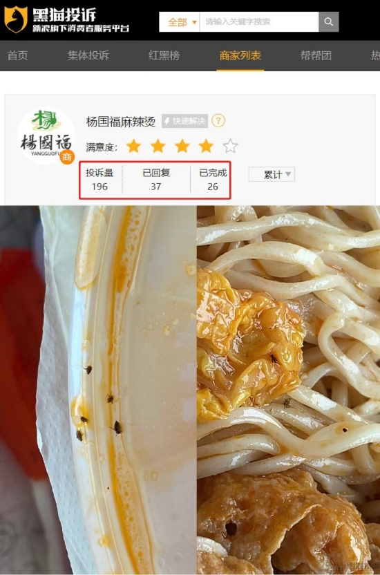 有消费者在黑猫投诉平台投诉称点了一份杨国福麻辣烫竟然陆续吃出八只虫子。还有消费者反映在杨国福麻辣烫中吃出蟑螂、蜜蜂、头发等。
