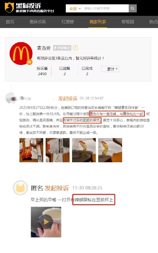 在黑猫投诉平台上,有不少消费者投诉麦当劳食品安全问题,例如麦乐鸡块的酱已经过期、在麦旋风中吃出头发、在豆浆杯中发现蟑螂屎、薯条上粘着油炸苍蝇等。