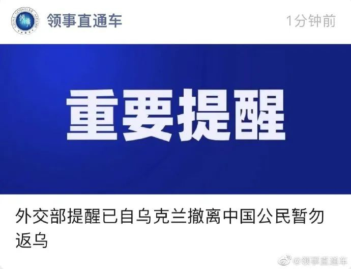 据“领事直通车”:当前,乌克兰安全形势严峻,乌西部地区日前安全风险亦显著上升。外交部和中国驻乌克兰使领馆提醒已撤离至乌周边国家的中国公民务必清醒认识乌当前安全形势,停留在安全地区,切勿贸然返回乌境内。少数自愿留乌人员务必注意安全,加强防范和应急准备,同时和中国驻乌使领馆保持联系。