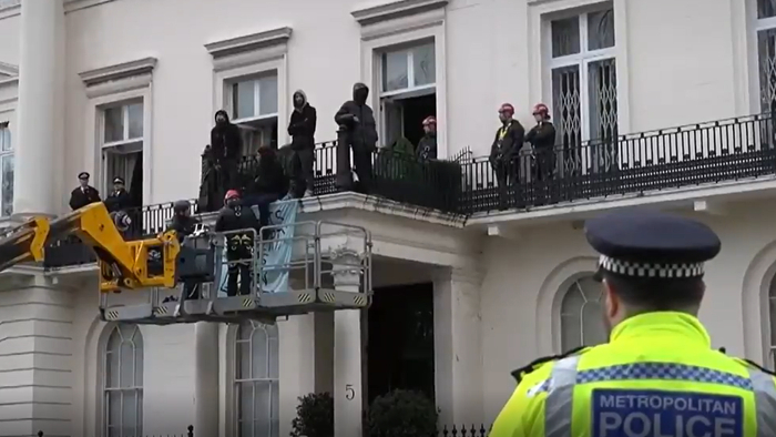 大约当地时间14日下午1点,一群示威者闯入贝尔格雷夫广场5号,并占据这处豪宅的阳台。BBC报道称,这批人在阳台待了大约7个小时,展示抗议横幅、高喊抗议口号。