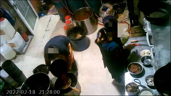 执法人员对该店厨房及操作间进行了突击检查。厨房内放置着多个桶,桶里的油料颜色不一。