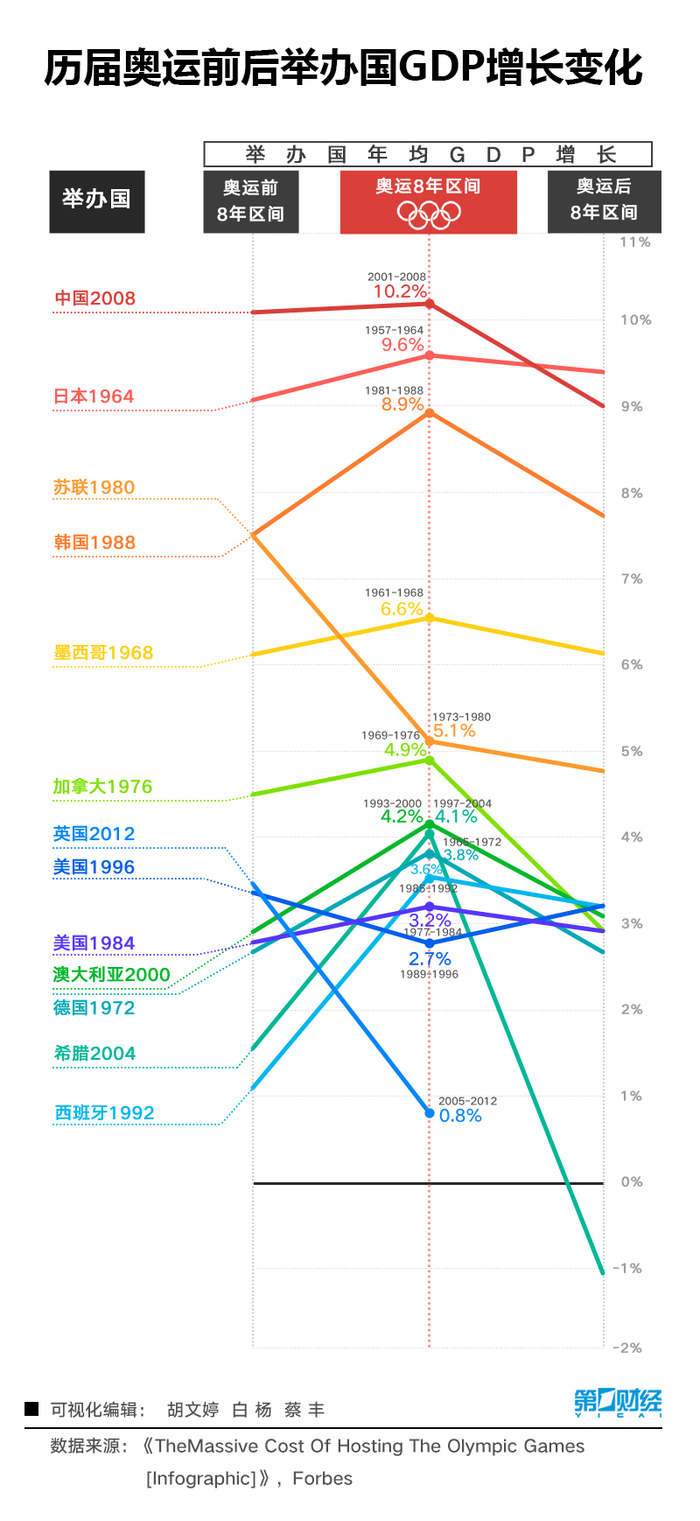 但在往后的8年里,这个数字通常会下跌,也就是所谓的后奥运经济的“低谷效应”。这也可以从往届奥运会主办国的GDP走向中窥见一二。多国“奥运后8年”的GDP增长速率出现下降趋势,尤其是2004年希腊雅典奥运会后,希腊GDP还出现了负增长。