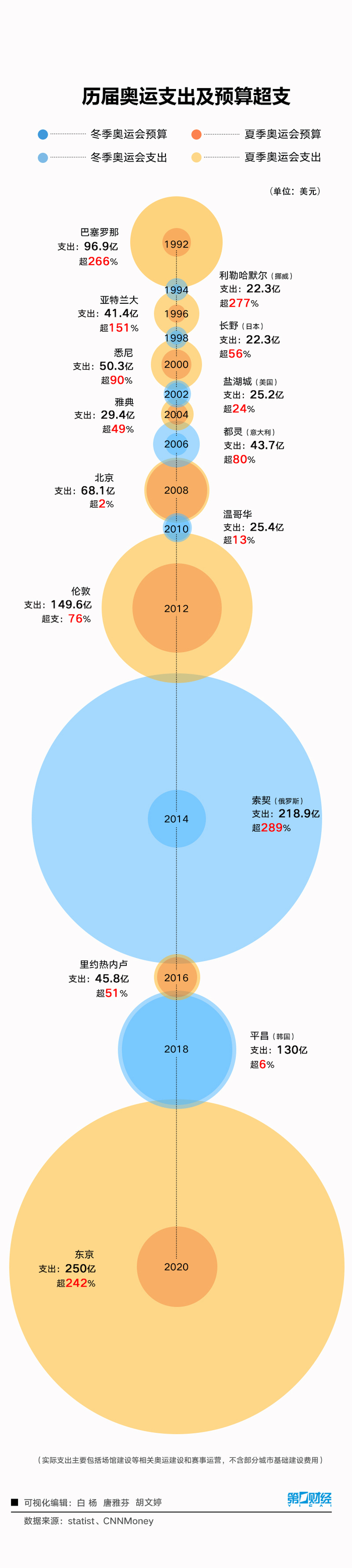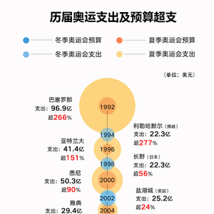 其中,奥运史上成本超支最多的一届是2014的索契冬奥会,超支率达到了289%。而东京奥运会因为突如其来的新冠疫情,延期一年,支出高达250亿美元,成为实际支出最多的一届奥运会。