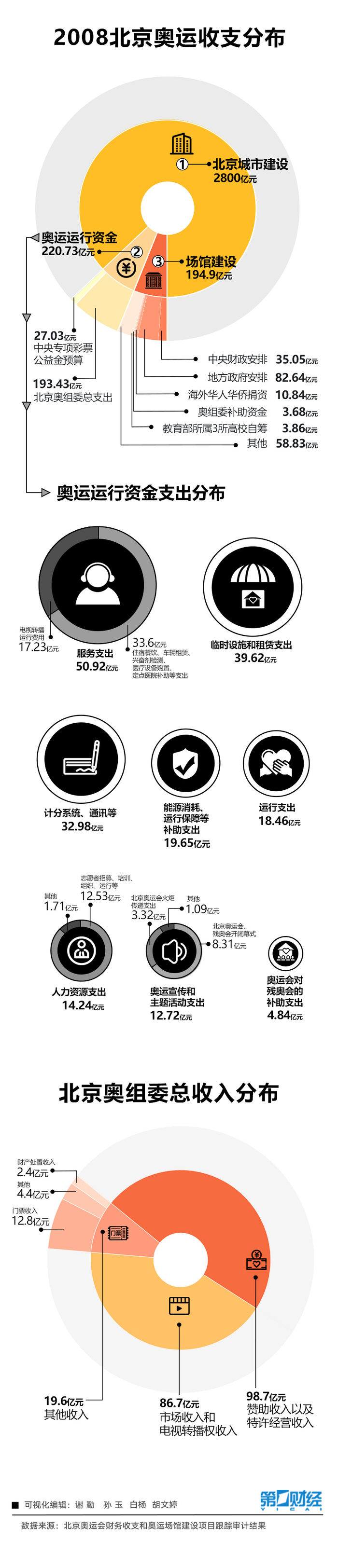 北京奥运的第二大支出才是真正和奥运赛事相关的运营保障支出,也是真正和常说的奥运盈亏相关一项。2008年北京奥运会在这块上支出220.73亿元,其中占比最大的是服务板块,这其中就包括了电视转播运营费用和住宿、车辆和医疗等支出,费用高达50.92亿元,约占总支出的23%。除此以外,运营方面还包含39.62亿元的临时设施的建设和租赁支出,32.98亿元的通讯设备、计分系统支出,19.65亿元的能源能耗等支出。这220.73亿元的运营保障费中,中央专项彩票公益金预算提供了27亿元,剩下的88%则是由北京奥组委支出。