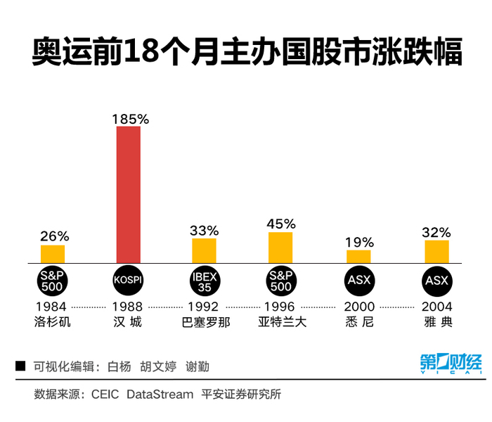 以1988年汉城奥运会为例。韩国综合股价指数在奥运会前18个月内暴涨185%。而在1981年至1988年期间,韩国GDP的年均涨幅则达到8.9%的高点。可见奥运会举办期间的经济刺激政策和各类建设需求的集中增加能明显带动当地经济的发展。