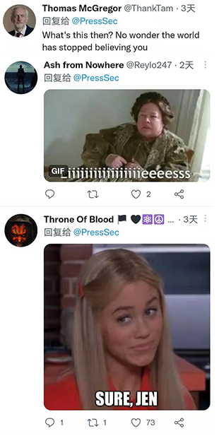 白宫新闻秘书普萨基10日连发8条推文,没有正面回应美国在乌实验室的研究内容,反而指责俄罗斯散布“虚假信息”。没拿出证据还倒打一耙,普萨基的推文一经发出就受到了海外网友的群嘲。