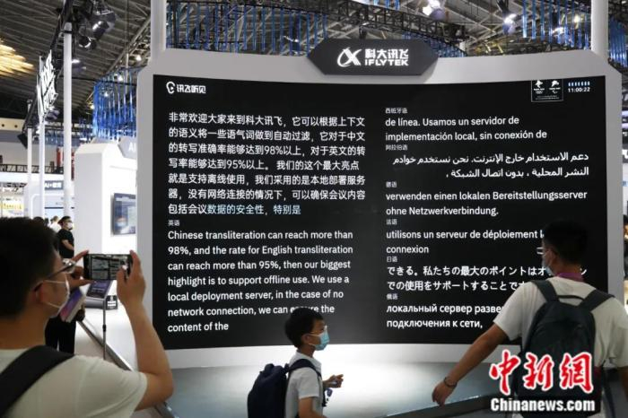 2021年7月8日,在2021世界人工智能大会(WAIC2021)上,科大讯飞展台展示的翻译终端,可同时翻译8国语言。中新社记者 张亨伟 摄