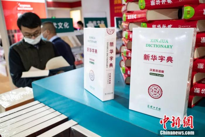 2021年4月1日,第34届北京图书订货会商务印书馆展区内展示的《新华字典》汉英双语版。作为新中国第一部现代汉语字典,《新华字典》在本届图书订货会上以汉英双解的形式全新面世,担当起国际语言文化交流新使命。中新社记者 侯宇 摄
