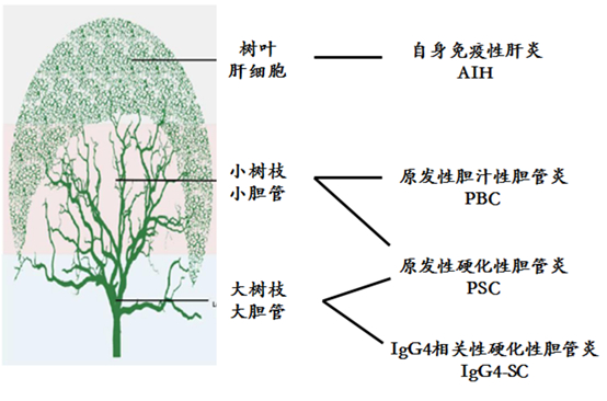 我们的肝脏主要由肝细胞、胆管等组成 ,可以将肝脏想象成一棵大树,树叶比作肝细胞、小树枝比作小胆管炎、大树枝比作大胆管。根据攻击的组织成分不同,自身免疫性肝病可分为以肝细胞损伤为主型,即自身免疫性肝炎(AIH),和以胆管损伤为主型,即原发性胆汁性肝硬化(PBC)、原发性硬化性胆管炎(PSC)和IgG4相关性硬化性胆管炎(IgG4-SC)。此外,上述疾病中任意两者同时出现则为重叠综合征,主要以AIH-PBC重叠综合征多见。今天就和大家介绍一下什么是自身免疫性肝病。