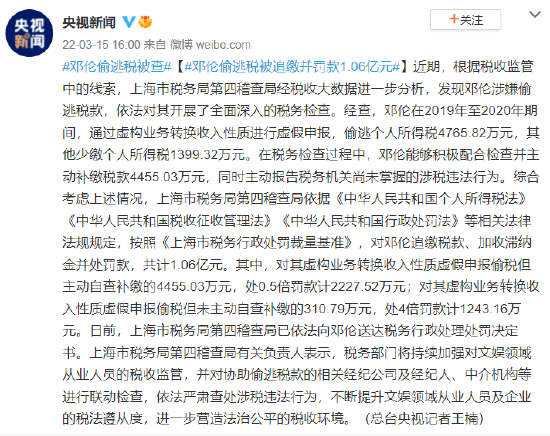 早前报道:邓伦偷逃税被追缴并罚款1.06亿元(央视新闻)