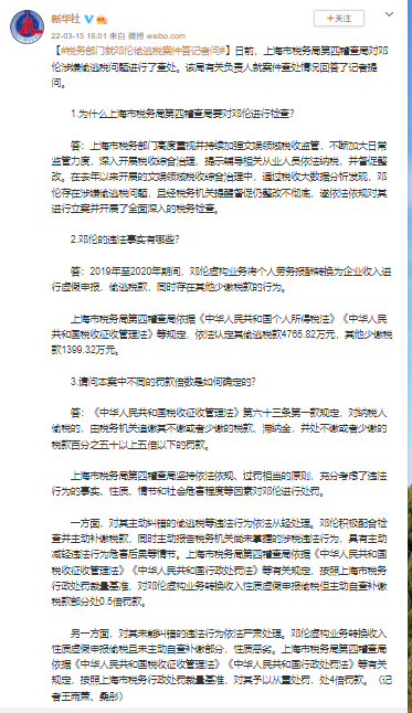 税务部门就邓伦偷逃税案件答记者问(新华社)