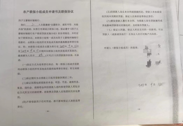 还有案件关系到联保小组组建的问题。一份2021年2月26日的二审判决书显示,一个五户联保小组向银行借款后,其中一户未能按期偿还本息,一审判决联保小组其他四户承担连带责任。其他四户提出上诉,称联保小组并非自愿组建,签合同时采取不碰面、不告知、只签字了事的形式自行编入五户联保,成员并未获得所有小组成员的同意,故不应承担连带责任。法院认为,各小组成员均认可合同中本人签字的真实性,不支持该上诉请求。