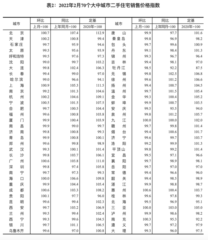 3月16日,国家统计局发布2022年2月70个大中城市商品住宅销售价格变动情况。数据显示,2022年2月份,新建商品住宅价格上涨城市数量为27个,较1月减少1城;持平城市为3个,与上月一致;下跌城市40个,较上月增加1城。从2月份二手住宅房价指数来看,房价上涨城市数量为10个,与上月保持一致;持平城市3个,较上月减少1个;下跌城市57个,比上月增加2个。