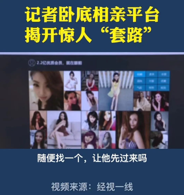 国内多家社交、婚恋网站近年来因此深陷信任危机。今年315前夕,广东经视新闻中心记者卧底报道,发现“我主良缘”“世纪佳缘”等婚恋平台存在“婚托”套路。