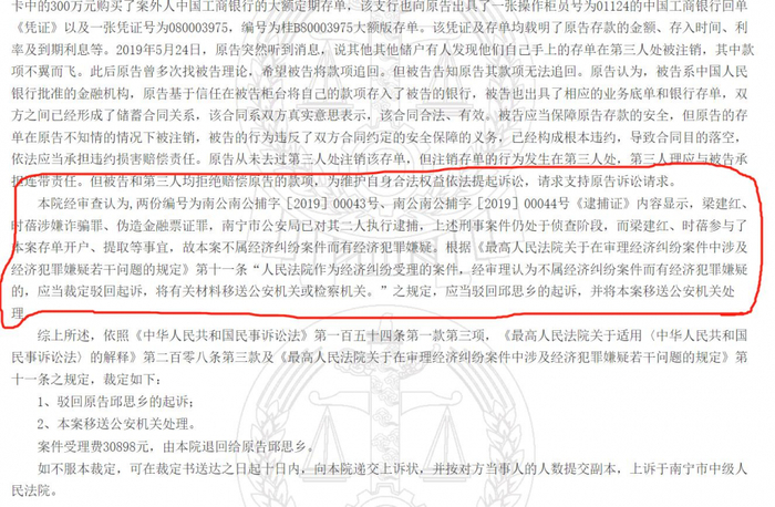 一审法院青秀区人民法院审查后认为:“两份《逮捕证》内容显示,梁建红、时蓓涉嫌诈骗罪、伪造金融票证罪,南宁市公安局已对其二人执行逮捕,上述刑事案件仍处于侦查阶段,而梁建红、时蓓参与了本案存单开户、提取等事宜,故本案不属经济纠纷案件而有经济犯罪嫌疑。根据‘人民法院作为经济纠纷受理的案件,经审理认为不属经济纠纷案件而有经济犯罪嫌疑的,应当裁定驳回起诉,将有关材料移送公安机关或检察机关。’之规定,应当驳回沈芸的起诉,并将本案移送公安机关处理。”青秀区人民法院判决以此为由裁定驳回原告沈芸的起诉,并将本案移送公安机关处理。