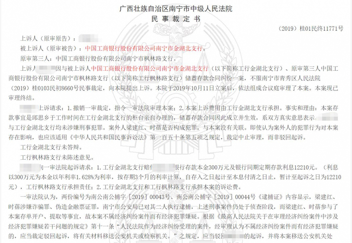 从一审法院广西壮族自治区南宁市青秀区人民法院发布的民事裁定书中,记者找到了事情的起因:2019年3月,原告沈芸将300万闲余资金存入工商银行金湖北支行作为定期存款。2019年3月6日,基于对银行的信任,她在工行金湖北支行柜台上将自己工商银行卡中的300万元购买了由案外人梁建红、时蓓经手办理的中国工商银行大额定期存单,该支行也向她出具了一张操作柜员号为01124的中国工商银行回单《凭证》以及一张凭证号为080003975,编号为桂B80003975大额版存单。