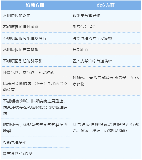 支气管镜检查可以用来做细菌学和细胞学检查,也可以活检采样,还可以开展息肉摘除等手术,适应范围较广,包括但不仅限于下表中所列出的适应症。