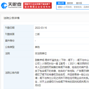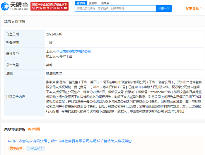 天眼查App显示,近日,法院刊登郑州市伟仕商贸有限公司、中山市彩意制衣有限公司致歉公告,两公司分别向易烊千玺致歉。