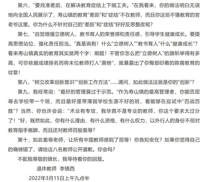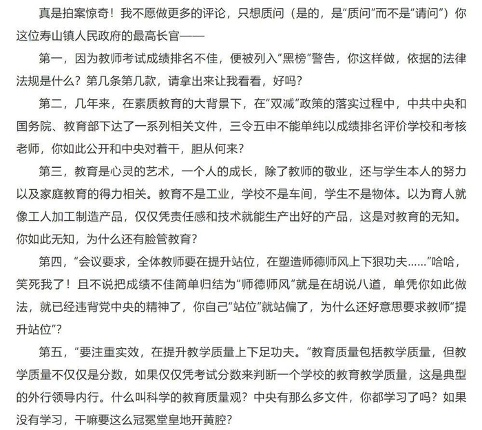 他在文章中“十问”寿山镇教师被“黑榜”警告事件。
