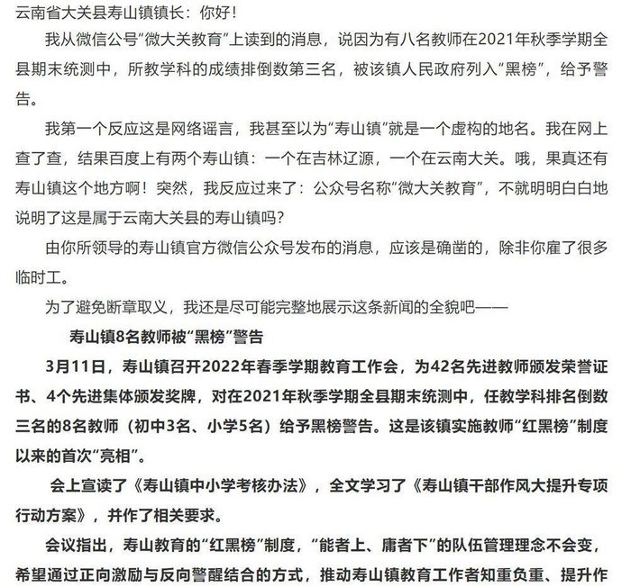 3月14日,云南省昭通市大关县委宣传部在官方公众号“微大关”上发布题为《寿山镇8名教师被“黑榜”警告》的文章称,3月11日,寿山镇召开2022年春季学期教育工作会,对在2021年秋季学期全县期末统测中,任教学科排名倒数三名的8名教师(初中3名、小学5名)给予黑榜警告。目前,该文已被删除。