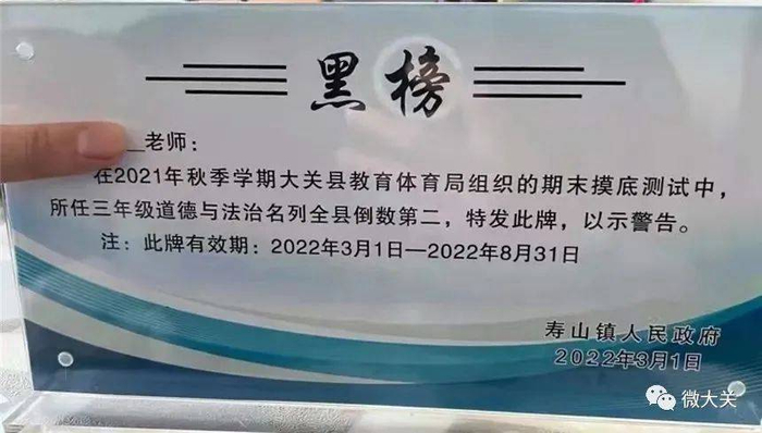 “黑榜警告牌”显示,某老师“在2021年秋季学期大关县教育体育局组织的期末摸底测试中,所任三年级道德与法治名列全县倒数第二,特发此牌,以示警告。”并且有“此牌有效期:2022年3月1日—2022年8月31日”字样。