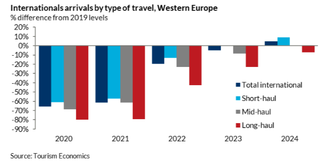 不过,上述机构认为,虽然跨大西洋旅行可能将在某种程度上提振西欧长期旅行需求,但由于一些旅行者对长途旅行持谨慎态度,因此短途旅行仍将是西欧旅游业复苏的主要驱动力。预计到2024年,西欧地区短途旅行将恢复至2019年水平,并推动该地区国际旅行的整体复苏。