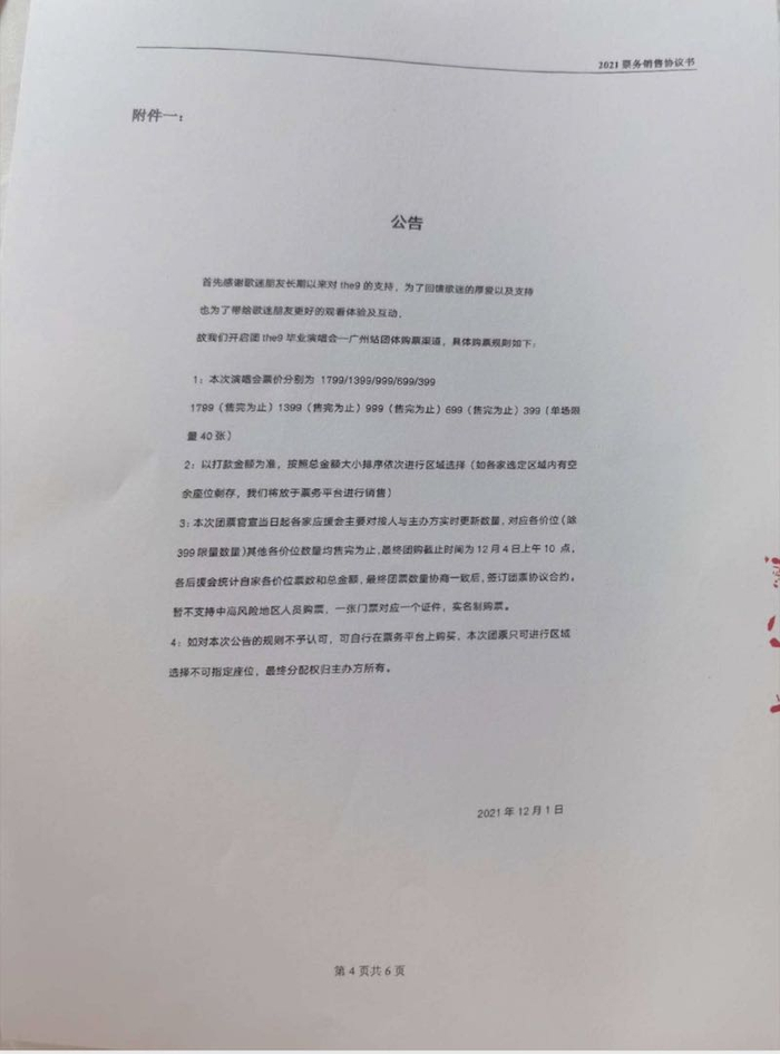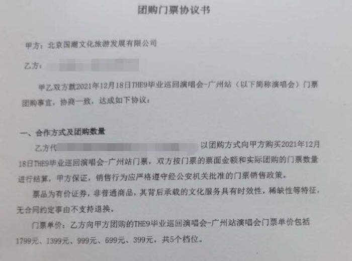 根据方荷提供的团购门票协议书显示:双方就2021年12月18日THE9毕业巡回演唱会-广州站门票团购事宜协商一致购买门票,门票价格分为1799元、1399元、999元、699元和399元。与粉丝签订协议的甲方是北京国潮文化旅游发展有限公司(下称“国潮文化”)。
