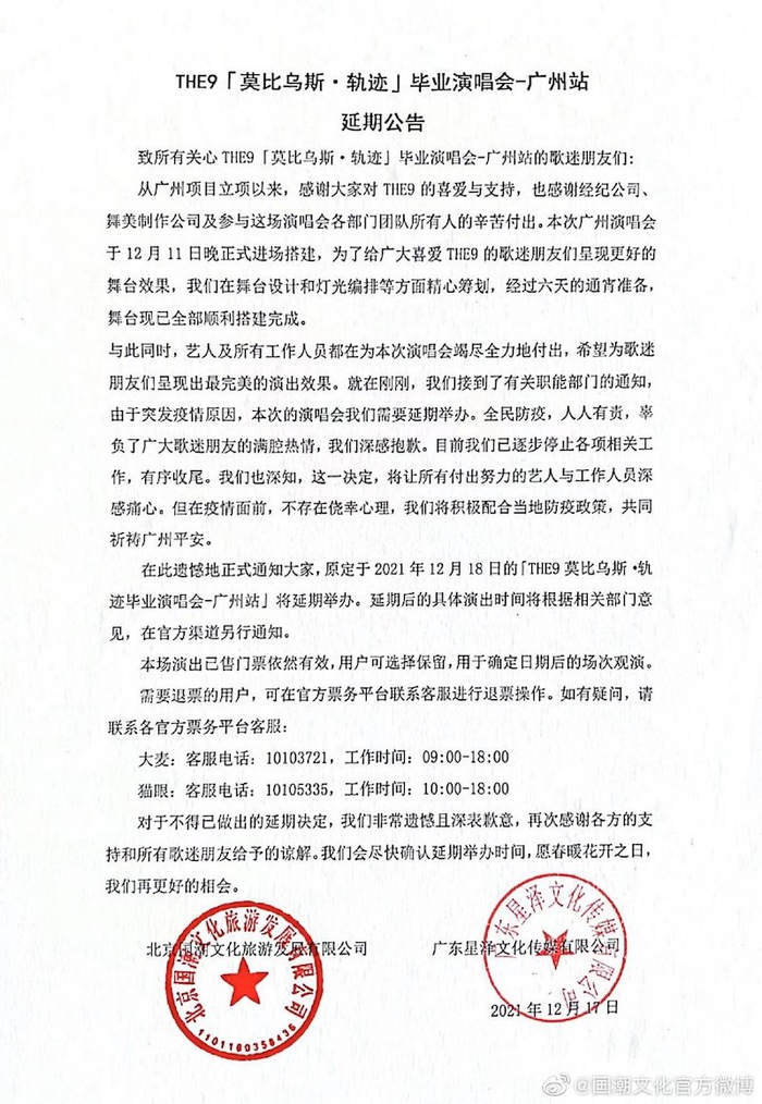 作为限定团,人气少女组合THE9本应在2021年的年底风风光光地开一场毕业演唱会,即组合解散演唱会,然后各自发展。然而因为疫情,THE9的这场演唱会被临时叫停,随之而来的问题浮现——退票如何处理。