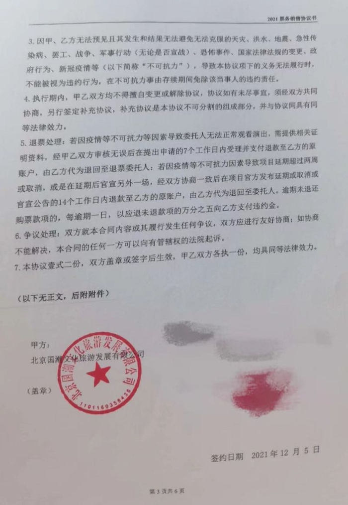 “看现在的样子,应该之后也很难再举行演唱会了,而且根据限定团的时间来看,其实THE9组合已经解散了,之后还能不能合体演出也是未知。所以我们很多粉丝都要求退票,根据协议,退票应该是在7个工作日内退款,如果是延期,那么应该于14个工作日内退款。在2022年1月7日-14日,主办方陆续退回一半左右的款项,但截至目前,各家后援会剩余款项均未退回,已经过了应该退款的日期。国潮文化以各种理由推迟退回款项,目前均已不回复信息。现在涉及要退款的粉丝量非常大,从去年购票到现在,我们都还没有获得全额退款。”方荷气愤地对第一财经记者表示。