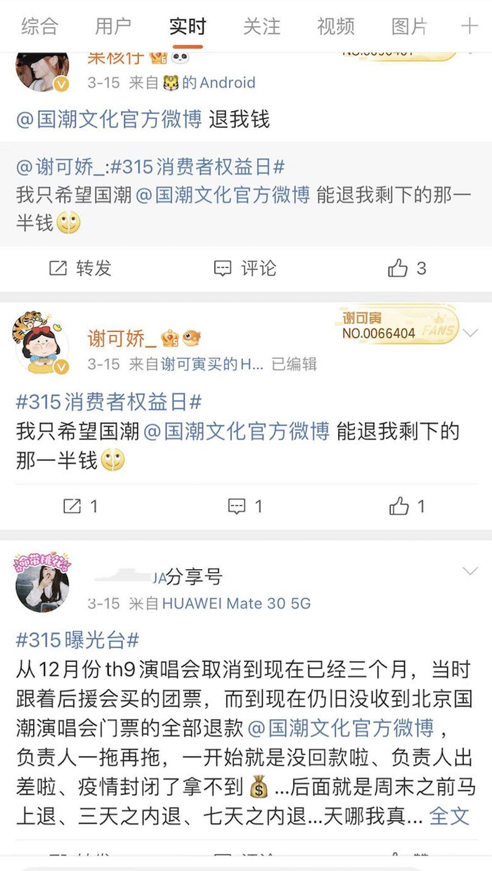 但粉丝们对于国潮文化的说法显然不买账,部分粉丝表示主办方一拖再拖,早就过了应该退款的期限,而且也不是“一小部分”,而是一半的款项都没有收到。