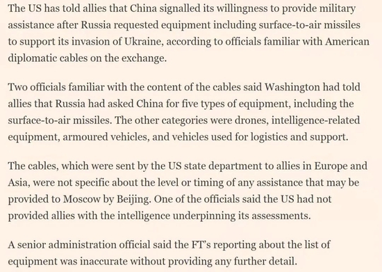 文章引述美国两名知情官员的话称,美国国务院已通知北约组织成员国和亚洲盟友,宣称“中国已表示愿意对俄罗斯提供军事支援”。而且,美国国务院还通过外交电报告诉盟友,“中国会否认这种计划的存在”。