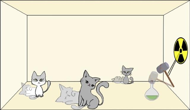薛定谔用一只猫来说明这种情况,设想一个封闭的房间里有一只猫和一瓶毒药,如果原子的衰变能够触发机械装置打破瓶子、释放毒药,那么猫必死无疑。但考虑到原子可能处在衰变或者未发生衰变的叠加态,这意味着房间里可能存在一只“又死又活”猫,即著名的“薛定谔的猫”。
