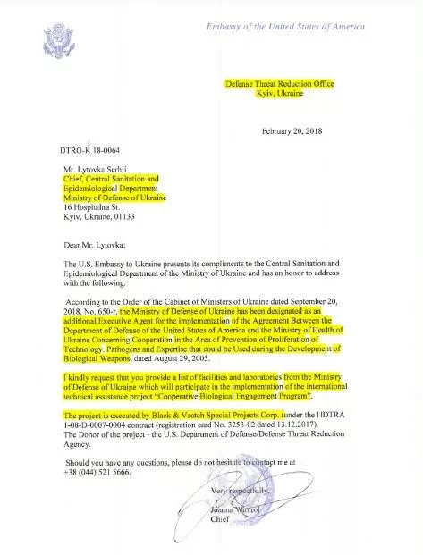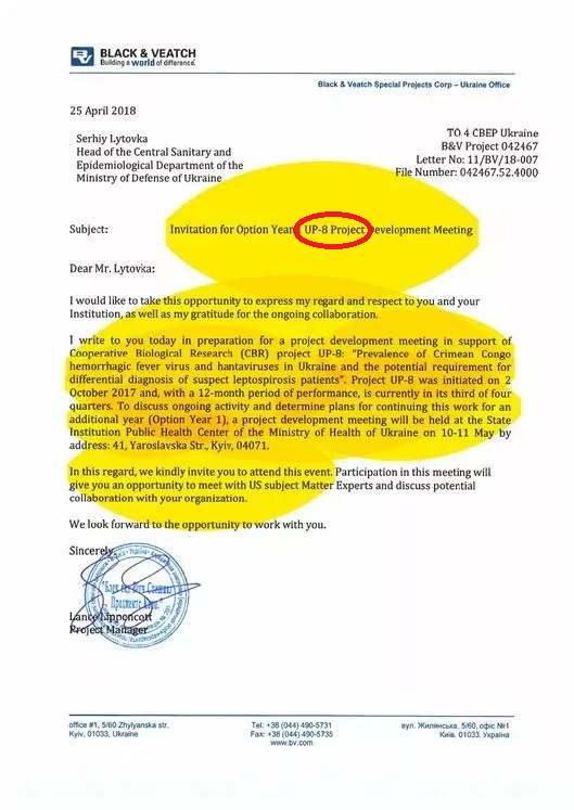 但基里洛夫展示的这份文件表示,美国通过与乌克兰签署的《联合生物活动协议》向乌克兰卫生部进行资助,而这些资金实际被用来资助乌克兰国防部位于基辅、敖德萨、利沃夫和哈尔科夫的实验室。美国国防威胁降低局(DTRA)和承包商BLACK&VEATCH将上述的乌克兰生物实验室选为“U-P8”项目的执行者,旨在研究克里米亚-刚果出血热、钩端螺旋体和汉坦病毒的病原体。