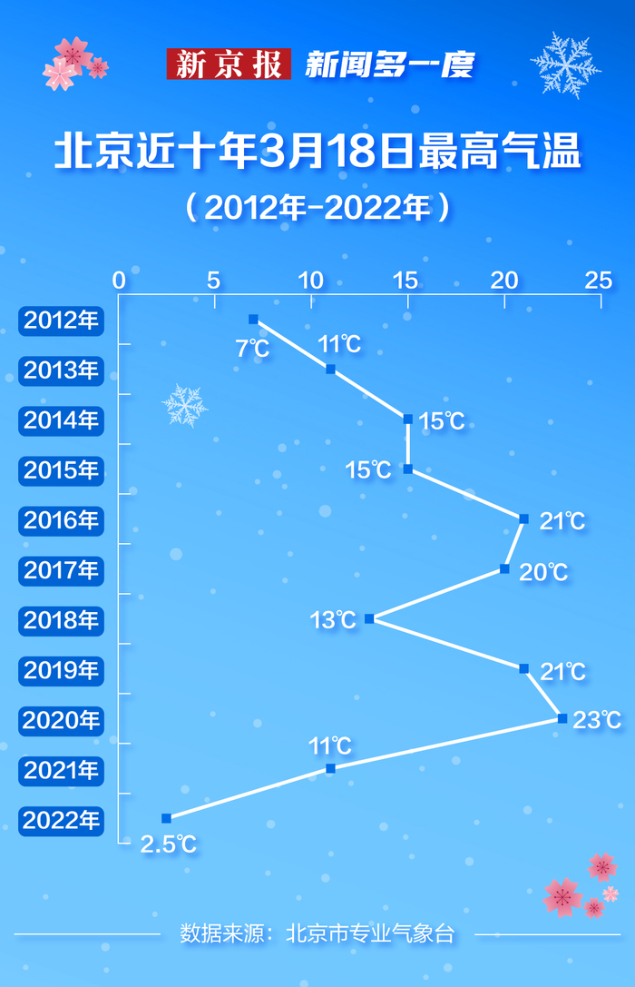受冷空气和降雪影响,气温明显下降,18日白天观象台最高气温为2.5℃,为近40年来同期第二低(近40年3月中旬观象台日最高气温的最低值为2.2℃,出现在1980年3月12日)。更多阅读《北京局地暴雪,今天最高气温为近40年来同期第二低》
