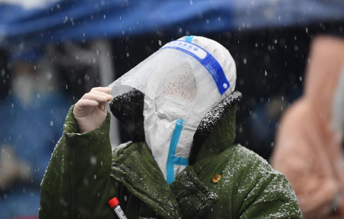 3月18日,南馆公园,医护人员雪中坚守岗位,防护面罩沾满雾气。