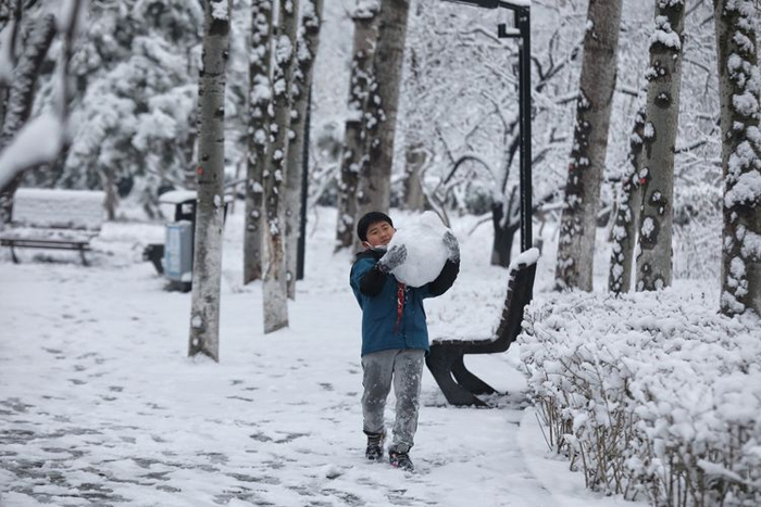 3月18日,南二环绿地,男孩抱起特大号雪球。