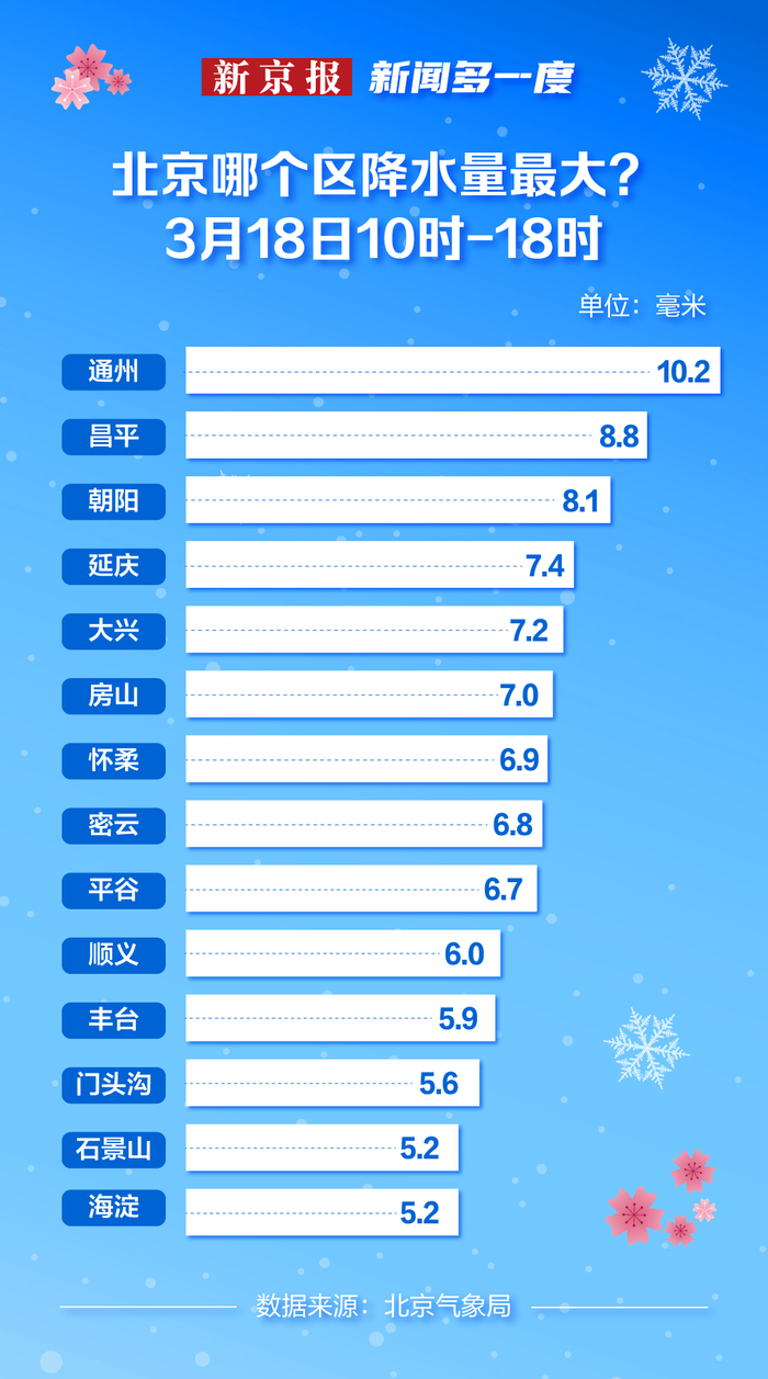 据@气象北京消息,北京3月18日10时至18时降水量(毫米):全市平均7.4,城区平均(朝,海,丰,石,东,西)7.4,东南(通,大)8.5,西北(延,昌)7.8,东北(密,顺,平,怀)7.2,西南(门,房)5.7,城区最大朝阳平房站11.4,全市最大通州梨园主题公园11.4,最大小时降水强度通州101农场5.6毫米/小时(18日16时-17时)。