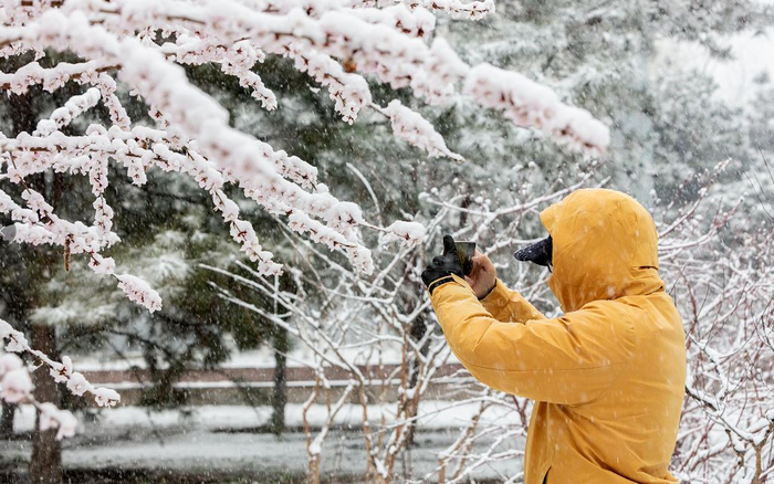 街边盛开的桃花、玉兰、迎春等都覆盖上了一层厚厚的雪被。路人被春花雪景迷住了,纷纷拿出手机拍照留念。