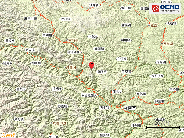 速报参数:据中国地震台网正式测定,3月19日0时45分在甘肃陇南市宕昌县发生3.6级地震,震源深度14千米,震中位于北纬33.77度,东经104.63度。